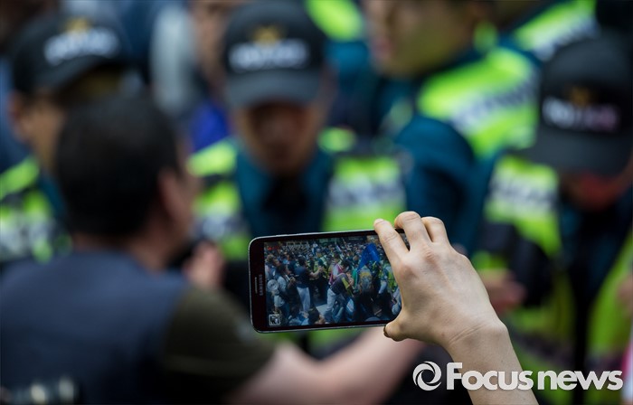 (서울=포커스뉴스) 8일 오후 서울 을지로 옛 국가인권위원회 옥상 광고탑에서 기아자동차 비정규직 노동자의 정규직화를 요구하며 363일 동안 고공농성을 벌인 한규협씨와 최정명씨가 경찰에 의해 구급차로 끌려가자 한 관계자가 이를 촬영하고 있다.
