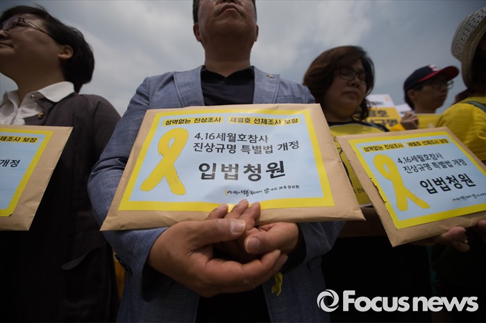 (서울=포커스뉴스) 8일 오전 서울 여의도 국회 앞에서 4.16가족협의회와 4.16연대 관계자들이 세월호 진상규명 특별법 개정 입법청원 기자회견을 하고 있다.