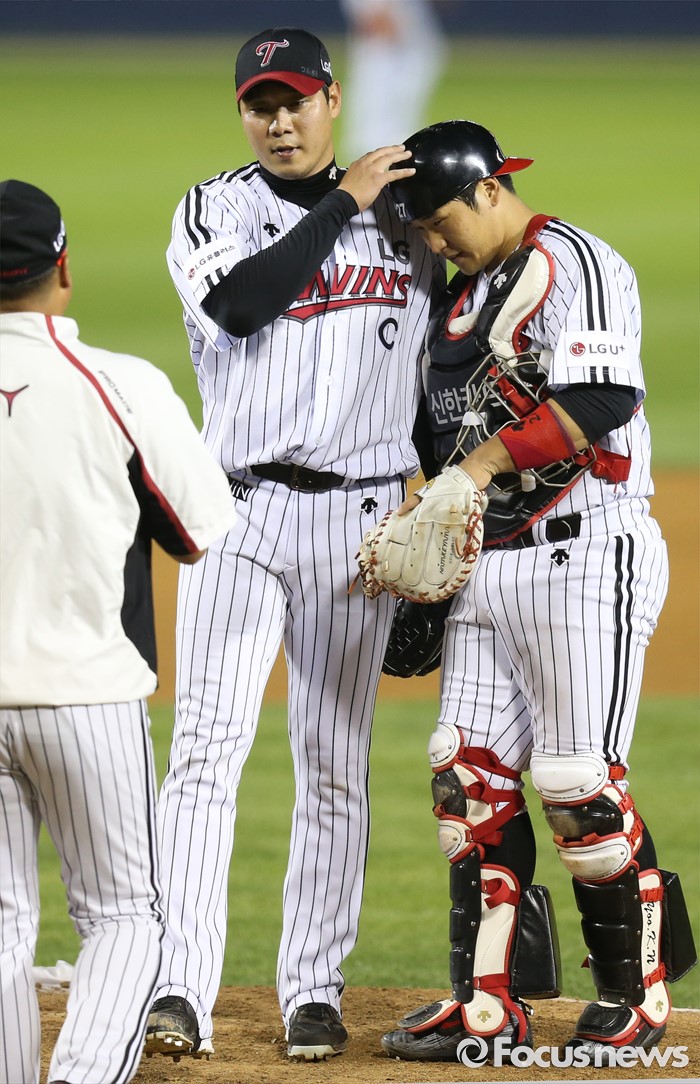 (서울=포커스뉴스) 8일 서울 잠실구장에서 열린 2016 프로야구 삼성-LG 경기 6회 2사후 LG 투수 류제국이 투수교체를 위해 마운드로 올라오는 강상수 코치를 기다리며 포수 유강남의 헬맷을 쓰다듬고 있다.