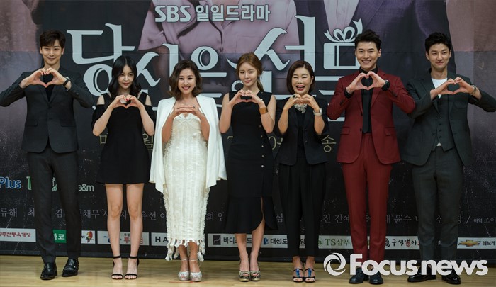 (서울=포커스뉴스) 8일 오후 서울 양천구 SBS 목동사옥에서 열린 SBS 일일드라마 '당신은 선물' 제작발표회에 참석한 배우 심지호(왼쪽부터), 허이재, 최명길, 진예솔, 김청, 송재희, 차도진이 포토타임을 갖고 있다.