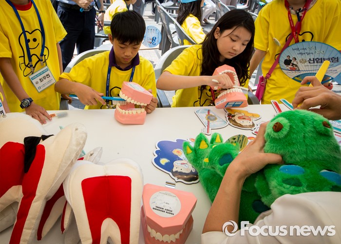(서울=포커스뉴스) 9일 오전 서울 청계광장에서 열린 제1회 서울시민 구강보건의 날 기념행사에 참석한 어린이들이 바른 칫솔질을 배우고 있다.