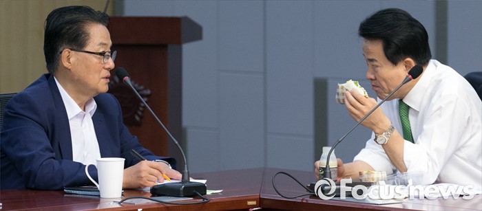 (서울=포커스뉴스) 8일 오전 서울 여의도 국회 의원회관에서 열린 국민의당 12차 정책역량강화 워크숍에 참석한 박지원(왼쪽) 원내대표와 정동영 의원이 대화하고 있다.
