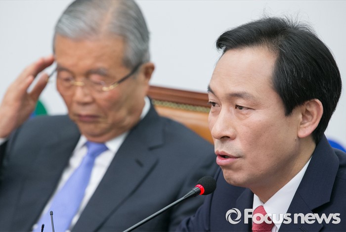 (서울=포커스뉴스) 8일 오전 서울 여의도 국회에서 열린 더불어민주당 비상대책위원회의에 참석한 우상호 원내대표가 발언하고 있다. 왼쪽은 김종인 비대위 대표.