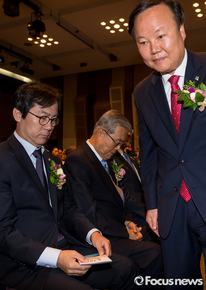 (서울=포커스뉴스) 10일 오전 서울 중구 프레스센터에서 열린 6.10 민주항쟁 제29주년 기념식에 참석한 김재원(오른쪽) 대통령실 정무수석이 김영우(왼쪽) 새누리당 비대위원, 김종인 더불어민주당 비대위 대표 앞을 지나가고 있다.