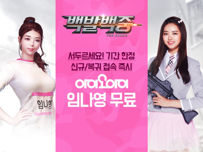 (서울=포커스뉴스) 넷마블게임즈(대표 권영식)는 모바일 슈팅게임 '백발백중 for Kakao'(이하 백발백중)에서 국민 걸그룹 아이오아이(I.O.I) 멤버 임나영 캐릭터를 8일 출시했다.