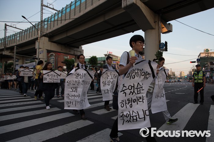 (서울=포커스뉴스) 지난달 28일 서울 지하철 2호선 구의역에서 스크린도어 정비 도중 숨진 김 모씨의 발인을 하루 앞둔 8일 오후 서울 광진구 지하철 2호선 구의역 인근에서 시민들이 김 모씨를 추모하며 행진하고 있다.