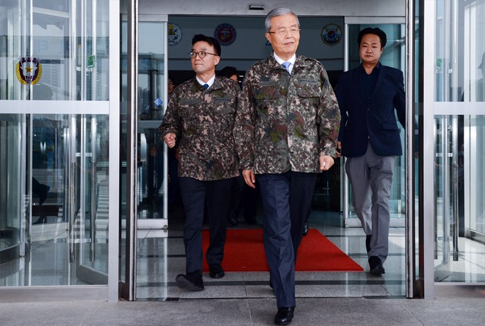 (서울=포커스뉴스) 김종인(가운데) 더불어민주당 비대위 대표가 8일 오전 서울 용산구 합동참모본부를 방문해 이동하고 있다. <사진제공=더불어민주당>