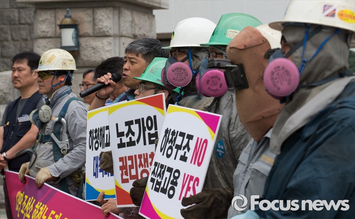 (서울=포커스뉴스) 8일 오전 서울 여의도 국회 앞에서 민주노총 금속노조 조합원들와 조선소 하청업체 직원들이 구조조정 중단과 고용안전 대책을 요구하는 기자회견을 하고 있다.