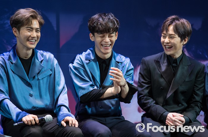 (서울=포커스뉴스) 8일 오전 서울 강남구 코엑스 아티움에서 열린 아이돌 그룹 엑소의 3집 앨범 'EX'ACT' 발표 쇼케이스에 참석한 멤버 수호(왼쪽부터), 첸, 시우민이 미소를 짓고 있다.