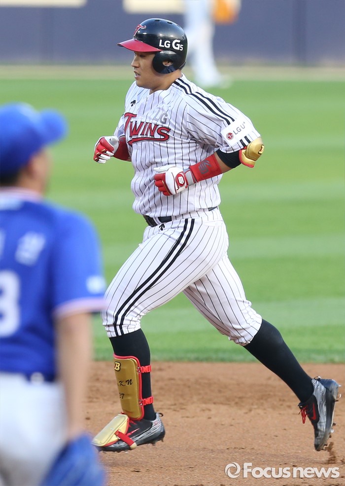 (서울=포커스뉴스) 9일 서울 잠실구장에서 열린 2016 프로야구 삼성-LG 경기 2회말 2사후 LG 유강남이 선제 좌월 솔로 홈런을 치고 그라운드를 달리고 있다.