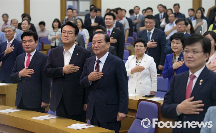 (서울=포커스뉴스) 8일 오전 서울 여의도 국회 의원회관에서 열린 국가미래전략포럼(일명 알파포럼) 창립총회 및 강연회에 참석한 최양희(앞줄 오른쪽부터) 미래창조과학부 장관, 서청원 새누리당 전 최고위원, 정진석 원내대표, 원유철 전 원내대표 등 참석자들이 국기에 대한 경례를 하고 있다. 이날 정 원내대표와 서 전 최고위원은 국회의장직을 야당에 양보한다는 뜻을 밝혔다.