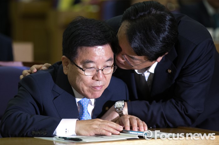 (서울=포커스뉴스) 8일 오전 서울 여의도 국회 의원회관에서 열린 국가미래전략포럼(일명 알파포럼) 창립총회 및 강연회에 참석한 정진석(오른쪽) 새누리당 원내대표와 김광림 정책위의장이 대화하고 있다. 이날 정 원내대표와 서 전 최고위원은 국회의장직을 야당에 양보한다는 뜻을 밝혔다.