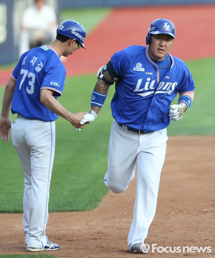(서울=포커스뉴스) 8일 서울 잠실구장에서 열린 2016 프로야구 삼성-LG 경기 2회초 삼성 선두타자 최형우가 우월 솔로 홈런을 치고 3루를 돌며 김재걸 코치와 악수하고 있다.