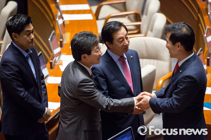(서울=포커스뉴스) 김성태 새누리당 의원과 유승민 무소속 의원이 9일 오후 서울 여의도 국회에서 열린 본회의에 참석해 동료의원들과 인사 하고 있다.