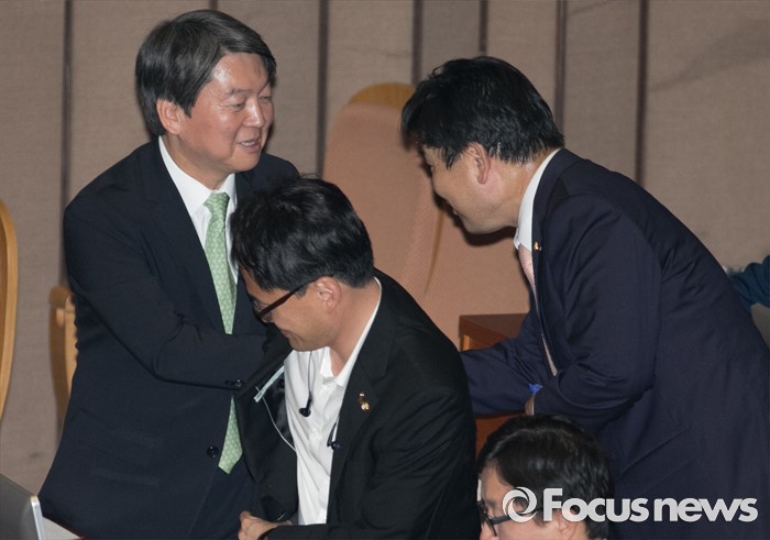 (서울=포커스뉴스) 9일 오후 서울 여의도 국회에서 열린 20대 국회 첫 본회의에 참석한 안철수(왼쪽) 국민의당 상임공동대표와 홍의락 무소속 의원이 인사하고 있다.