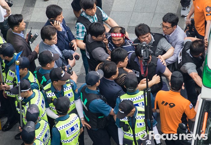(서울=포커스뉴스) 8일 오후 서울 을지로 옛 국가인권위원회 옥상 광고탑에서 기아자동차 비정규직 노동자의 정규직화를 요구하며 363일 동안 고공농성을 벌인 최정명씨가 경찰에 의해 구급차로 끌려가고 있다.