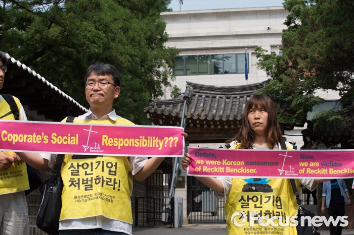 (서울=포커스뉴스) 10일 오전 서울 중구 주한영국대사관 앞에서 가습기살균제 피해 가족과 환경보건시민센터 시민 단체 관계자들이 영국대사와의 면담을 위해 들어가기 전 피켓을 들고 있다.