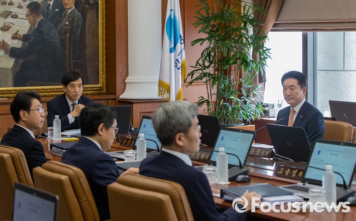 (서울=포커스뉴스) 9일 오전 서울 중구 남대문로 한국은행 본관에서 열린 금융통화위원회 본회의에 참석한 이주열 한국은행 총재 및 금통위원들이 취재진의 퇴장을 기다리고 있다.