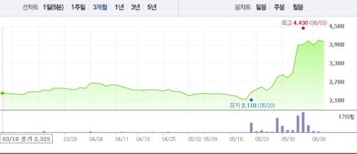 이는 1달 전 주가인 5월9일(2325원)과 비교했을 때 71.8% 상승한 수치다.