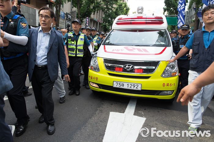 (서울=포커스뉴스) 사내하청 전원 정규직화를 요구하며 고공농성을 벌여온 기아자동차 사내하청 노동자 최정명씨와 한규협씨가 농성을 해제한 8일 오후 서울 중구 옛 국가인권위원회 건물 옥상 광고탑 농성장에서 내려와 병원으로 이동하던 중 경찰과 노조원들이 실랑이를 벌이고 있다.