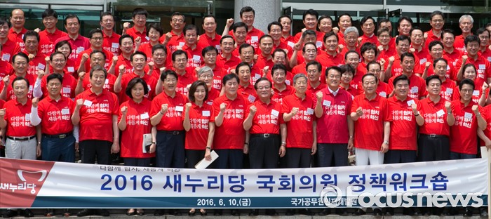 (과천=포커스뉴스) 10일 오전 경기도 과천 국가공무원인재개발원에서 열린 2016 새누리당 정책워크숍에 참석한 김희옥 혁신비대위원장, 정진석 원내대표 등 의원들이 기념촬영을 하고 있다.