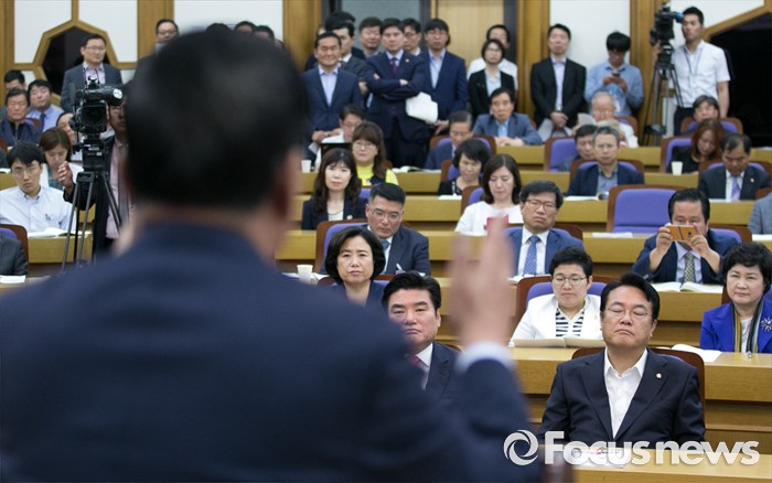 | △ 서청원 발언 듣는 정진석 원내대표와 의원들 |
