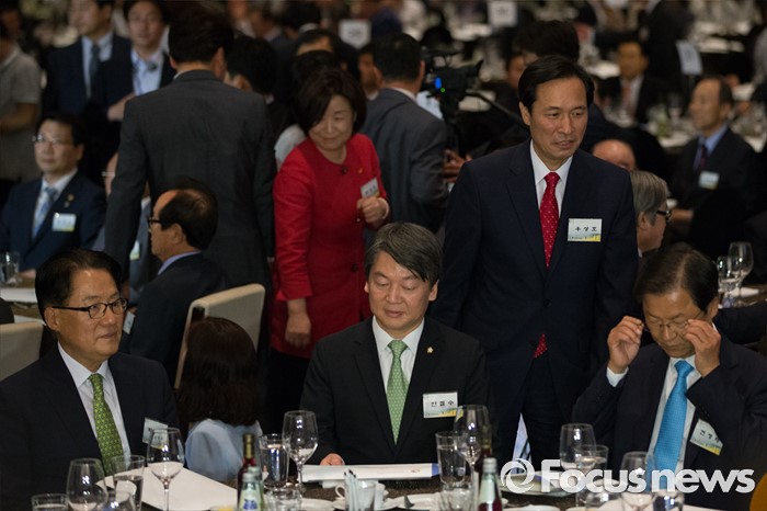 (서울=포커스뉴스) 9일 오후 서울 여의도구 63빌딩 그랜드볼룸에서 열린 '6.15 남북정상회담 16주년 기념식'에 정치인들이 참석하고 있다. 왼쪽부터 박지원 국민의당 원내대표, 안철수 국민의당 공동대표, 우상호 더불어민주당 원내대표, 천정배 국민의당 공동대표.