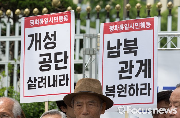 (서울=포커스뉴스) 8일 오전 서울 종로구 정부서울청사 앞에서 615공동선언실천 남측위원회가 6.15공동선언발표 16주년 기념 남북관계 개선 촉구 기자회견을 하고 있다.