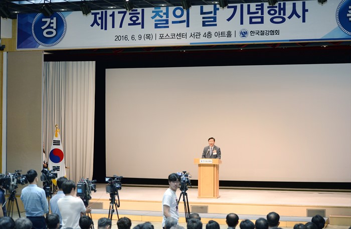 (서울=포커스뉴스) 주형환 산업통상자원부 장관이 9일 서울 포스코센터 서관 아트홀에서 열린 제17회 철의 날 기념식에 참석해 축사를 하고 있다.