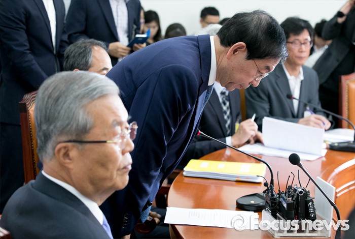 (서울=포커스뉴스) 8일 오전 서울 여의도 국회에서 구의역 스크린도어 노동자 사망 사건과 관련해 열린 더불어민주당-서울시 정책간담회에 참석한 박원순(왼쪽 두번째) 서울시장이 발언을 마친 뒤 사과하고 있다. 왼쪽 첫번째는 김종인 비대위 대표.
