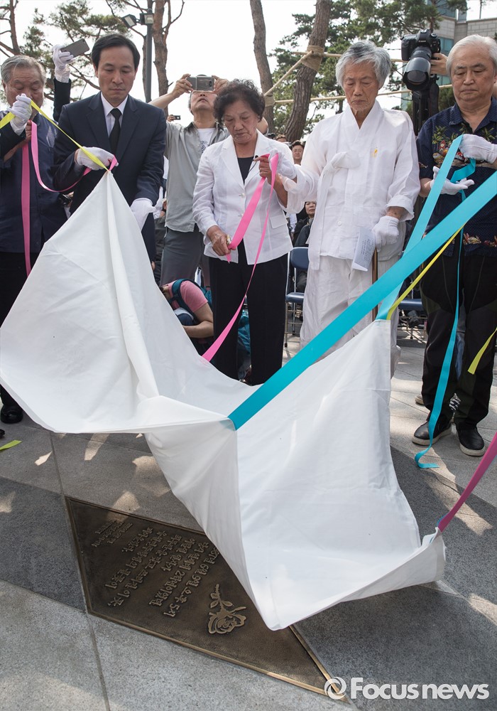 (서울=포커스뉴스) 9일 오후 서울 서대문구 연세대학교 정문 앞에서 '제29주기 이한열 열사 동판 제막식'이 열리고 있다. 왼쪽부터 이한열 열사가 쓰러지는 사진을 찍었던 전 로이터 통신 사진기자 정태원, 87년 당시 연세대학교 총학생회장을 지낸 더불어민주당 우상호 의원, 고 이한열 열사의 어머니 배은심 여사.