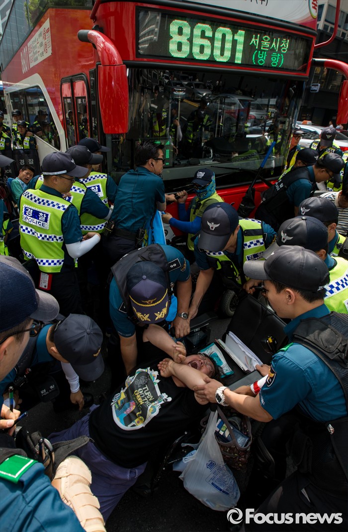 (서울=포커스뉴스) 9일 오전 서울시청 서소문별관 인근의 버스정류장에서 장애인차별철폐연대 회원들이 장애인 이동권 보장을 촉구하며 경기도행 광역버스 기습 점거시위를 벌여 경찰과 충돌하고 있다.