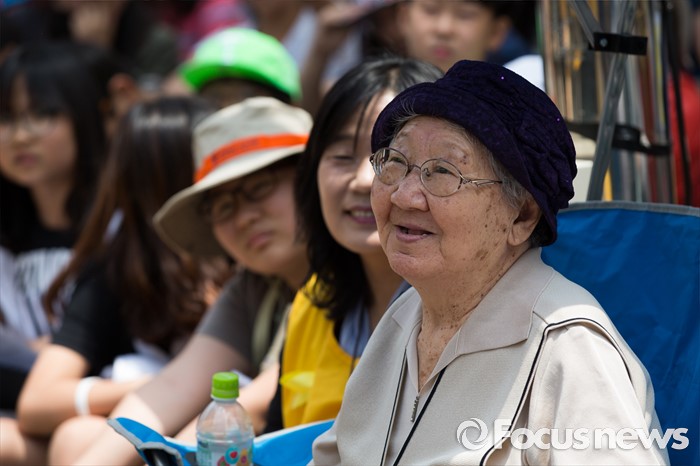 (서울=포커스뉴스) 8일 오후 서울 종로구 옛 일본대사관 앞에서 열린 제 1234차 일본군 위안부 문제해결을 위한 정기 수요시위에서 길원옥 할머니가 미소를 짓고 있다.