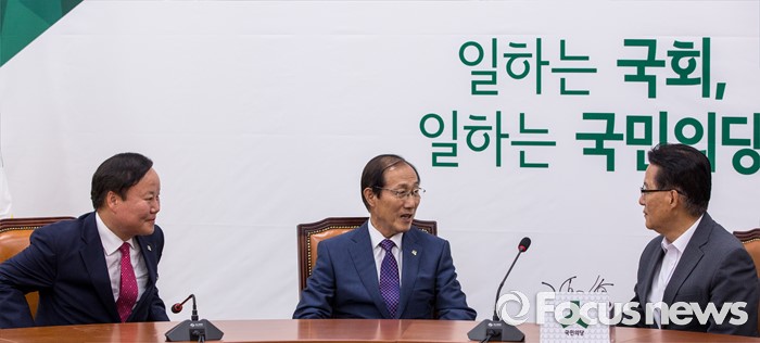 (서울=포커스뉴스) 박지원(오른쪽) 국민의당 원내대표가 10일 오후 서울 여의도 국회에서 이원종(가운데) 대통령비서실장, 김재원 청와대 정무수석과 면담을 하고 있다.