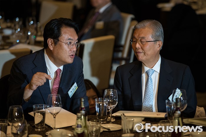 (서울=포커스뉴스) 9일 오후 서울 여의도구 63빌딩 그랜드볼룸에서 열린 '6.15 남북정상회담 16주년 기념식'에 참석한 정진석 새누리당 원내대표(왼쪽)와 김종인 더불어민주당 비상대책위원회 대표가 대화하고 있다.