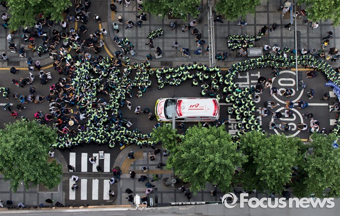 (서울=포커스뉴스) 사내하청 전원 정규직화를 요구하며 고공농성을 벌여온 기아자동차 사내하청 노동자 최정명씨와 한규협씨가 농성을 해제한 8일 오후 서울 중구 옛 국가인권위원회 건물 옥상 광고탑 농성장에서 내려와 병원으로 이동하던 중 경찰과 노조원들이 실랑이를 벌이고 있다.