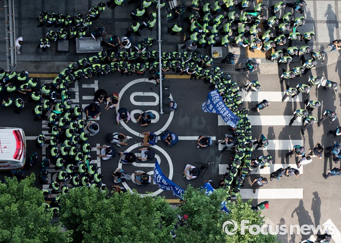 (서울=포커스뉴스) 사내하청 전원 정규직화를 요구하며 고공농성을 벌여온 기아자동차 사내하청 노동자 최정명씨와 한규협씨가 농성을 중단한 8일 오후 서울 중구 옛 국가인권위원회 건물 옥상 광고탑 농성장에서 내려와 병원으로 이동하던 중 경찰과 노조원들이 실랑이를 벌이고 있다.