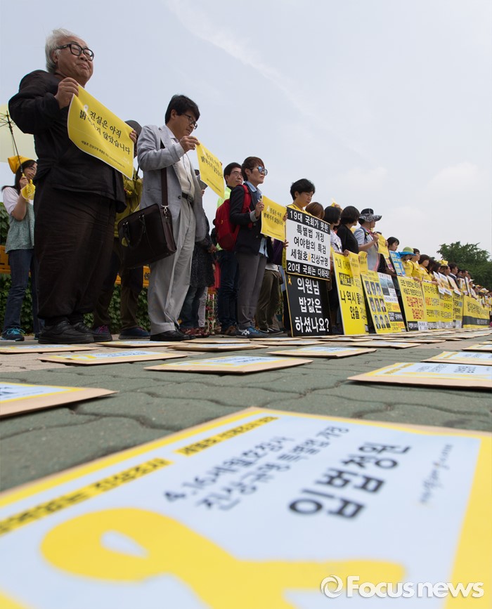 (서울=포커스뉴스) 8일 오전 서울 여의도 국회 앞에서 4.16가족협의회와 4.16연대 관계자들이 세월호 진상규명 특별법 개정 입법청원 기자회견을 하고 있다.