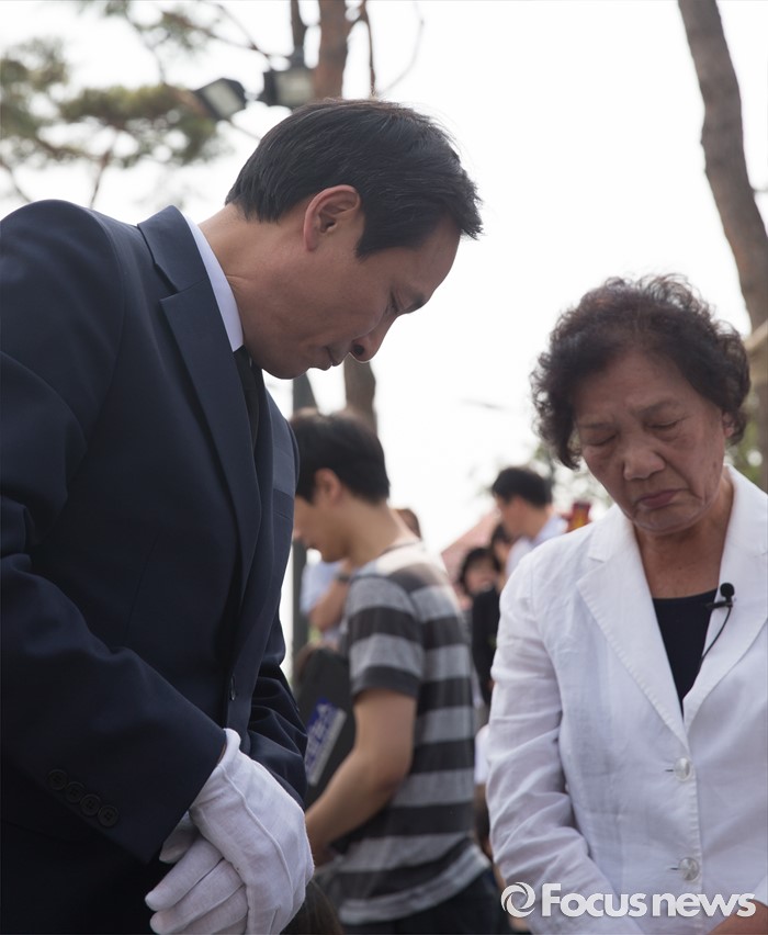 (서울=포커스뉴스) 9일 오후 서울 서대문구 연세대학교 정문 앞에서 열린 '제29주기 이한열 열사 동판 제막식에 참석한 더불어민주당 우상호 의원과 배은심 이한열 열사의 어머니가 동판을 지켜보고 있다.
