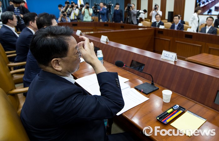 (서울=포커스뉴스) 8일 오전 서울 종로구 정부서울청사에서 열린 구조조정 관계장관회의에 참석한 유일호 경제부총리 겸 기획재정부 장관이 취재진의 퇴장을 기다리고 있다.