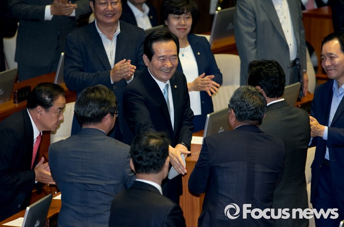 (서울=포커스뉴스) 9일 오후 서울 여의도 국회에서 열린 20대 국회 첫 본회의에서 전반기 국회의장으로 공식 선출된 정세균 더불어민주당 의원이 동료 의원들의 축하를 받고 있다.