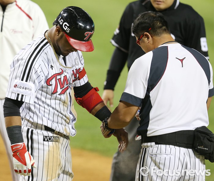 (서울=포커스뉴스) 8일 서울 잠실구장에서 열린 2016 프로야구 삼성-LG 경기 4회말 무사 1루에서 삼성 장필준의 투구에 왼손을 맞은 LG 히메네스가 트레이너의 치료를 받고 있다.