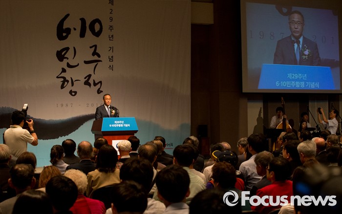 (서울=포커스뉴스) 10일 오전 서울 중구 프레스센터에서 열린 6.10 민주항쟁 제29주년 기념식에 참석한 홍윤식 행정자치부 장관이 박근혜 대통령의 기념사를 대독하고 있다.
