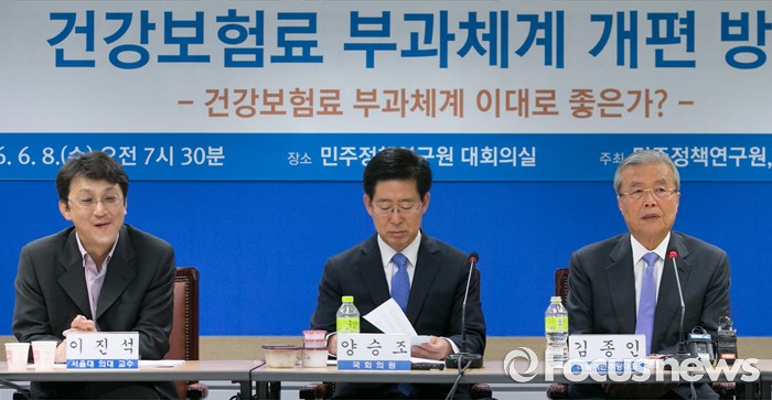 (서울=포커스뉴스) 8일 오전 서울 여의도 민주정책연구원에서 '건강보험 부과체계 개편 방안' 주제로 열린 사회경제포럼에 참석한 김종인 더불어민주당 비대위 대표가 인사말을 하고 있다. 왼쪽부터 이진석 서울대 의대 교수, 양승조 의원, 김 대표.