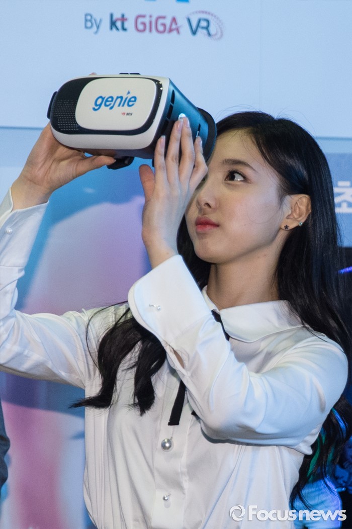 (서울=포커스뉴스) 9일 오전 서울 종로구KT스퀘어에서 열린 KT뮤직 VR서비스 론칭 기자간담회에 참여한 걸그룹 트와이스의 멤버 나연이 관련 서비스를 체험하고 있다.