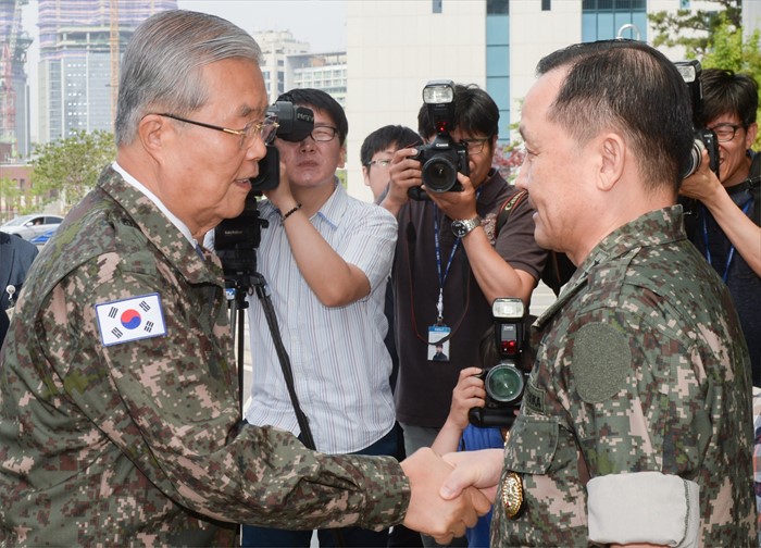 (서울=포커스뉴스) 김종인(왼쪽) 더불어민주당 비대위 대표가 8일 오전 서울 용산구 합동참모본부를 방문해 이순진 합참의장과 인사하고 있다.<사진제공=더불어민주당>