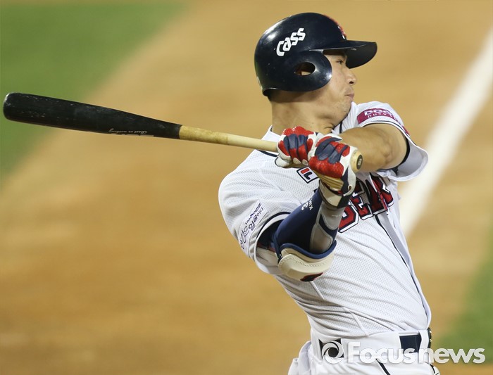 | △ 역전 홈런 날리는 두산 김재환 |