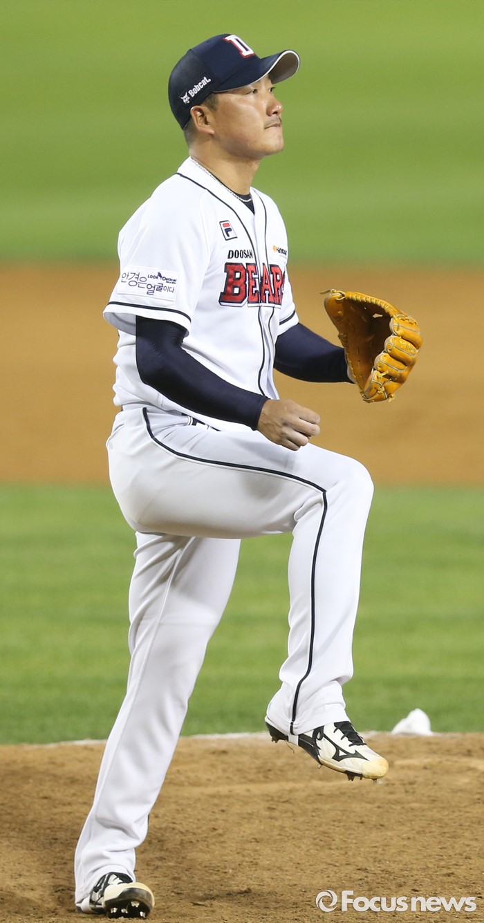 (서울=포커스뉴스) 10일 서울 잠실구장에서 열린 2016프로야구 롯데-두산 경기 8회초 2사 2,3루에서 두산 투수 정재훈이 롯데 강민호를 삼진 아웃시키고 돌아서며 마운드를 내려 오고 있다.
