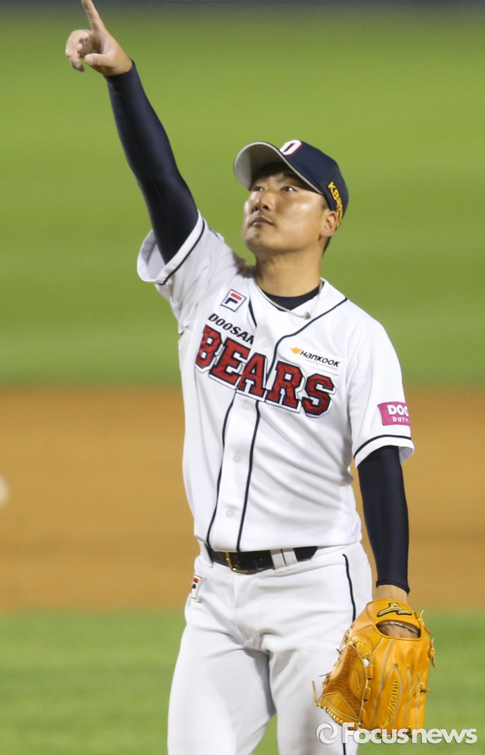 (서울=포커스뉴스) 10일 서울 잠실구장에서 열린 2016프로야구 롯데-두산 경기 8회초 2사 2,3루에서 두산 투수 정재훈이 롯데 강민호의 파울 타구를 가리키고 있다.