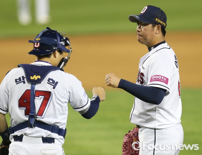 (서울=포커스뉴스) 10일 서울 잠실구장에서 열린 2016프로야구 롯데-두산 경기에서 9회초에 등판해 승리를 지킨 마무리 투수 이현승이 포수 박세혁과 주먹을 마주치고 있다.